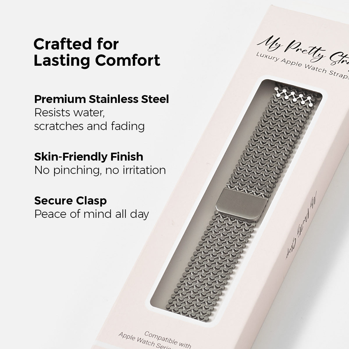 Crafted from premium stainless steel and twisted into elegant woven link chains, this watch band elevates your Apple Watch with its luxurious look & feel. Each watch band comes with its own metal adapter, designed to fit your Apple Watch seamlessly straight from the box.